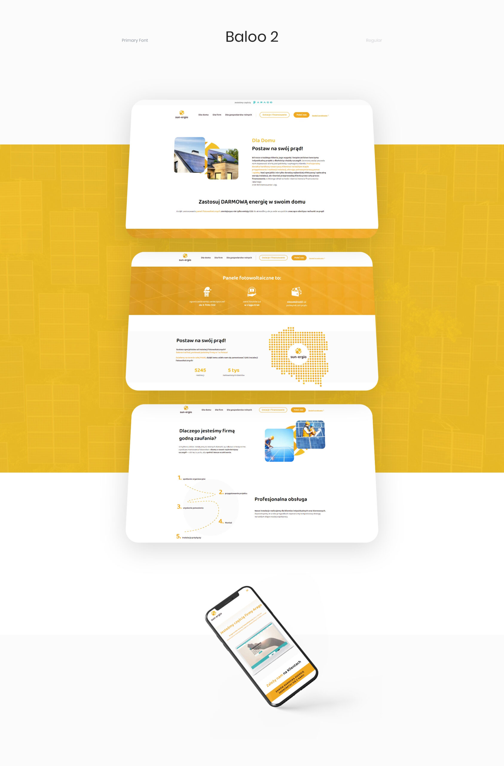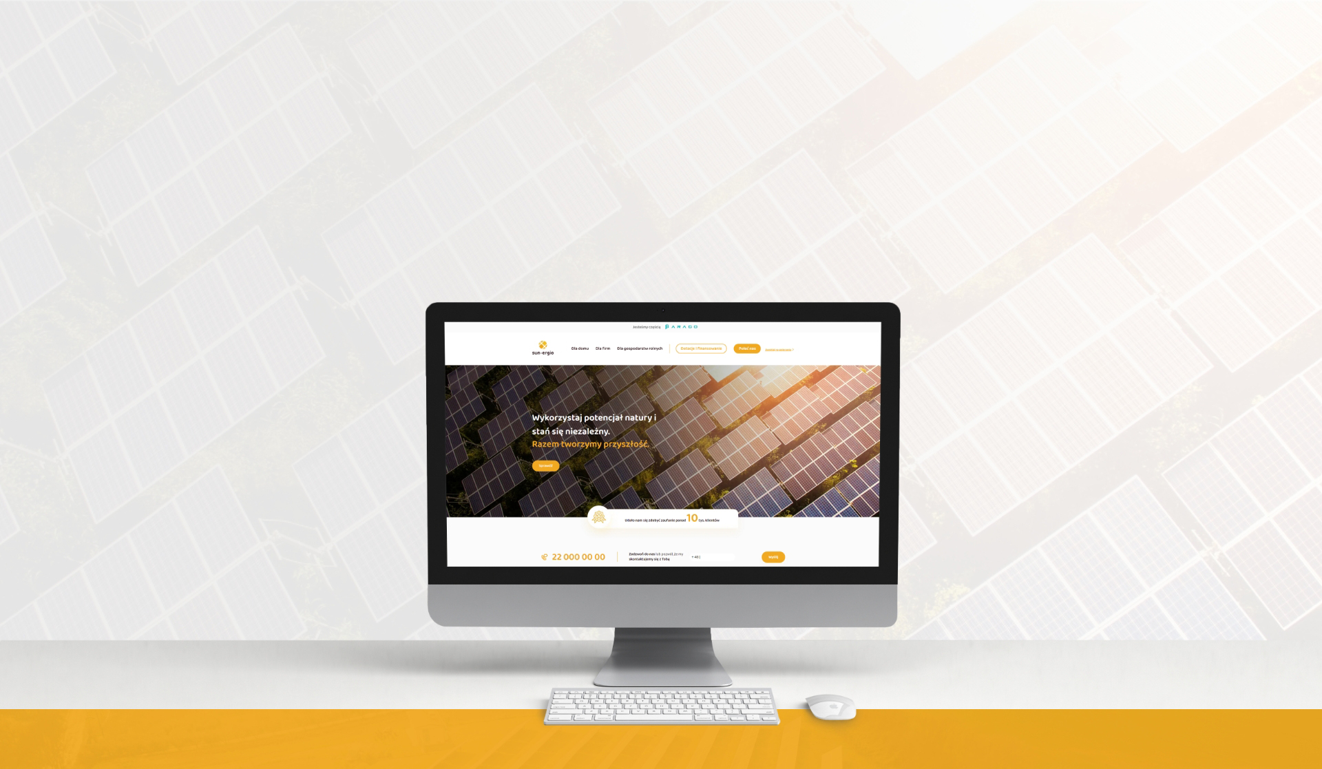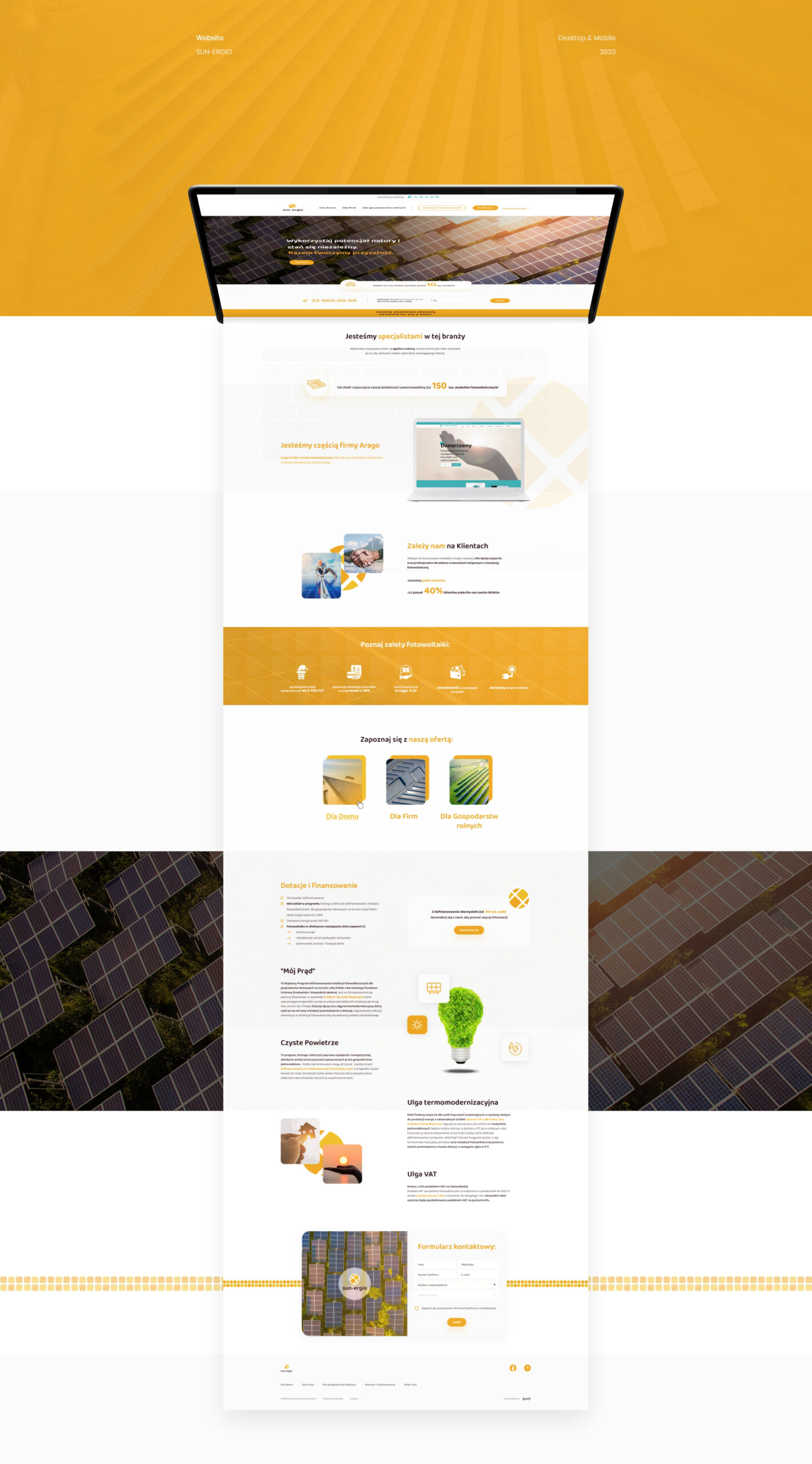 Jasny i przejrzysty interfejs z poczuciem czystości i oddechu przełamany, i uzupełniony energetycznymi akcentami żółcieni i oranżów to nasza propozycja dla firmy Sun-Ergio, realizującej instalacje paneli fotowoltaicznych. Minimalistyczne podejście, wąska gama barwna oraz dbałość o światło korzystnie wpływają na czytelność treści, a animacje i mikrointerakcje elementów graficznych angażują użytkownika, przykuwając jego uwagę.